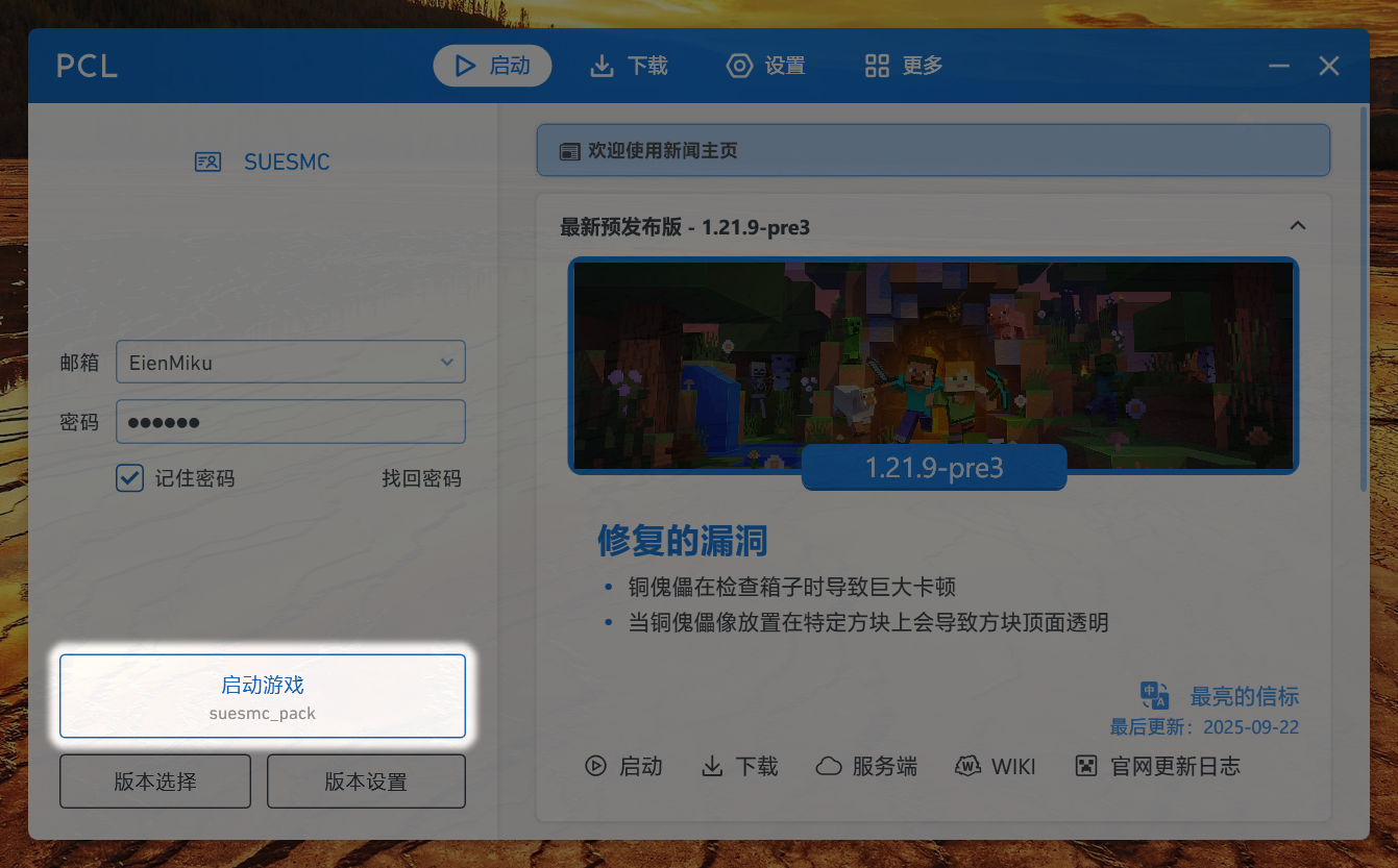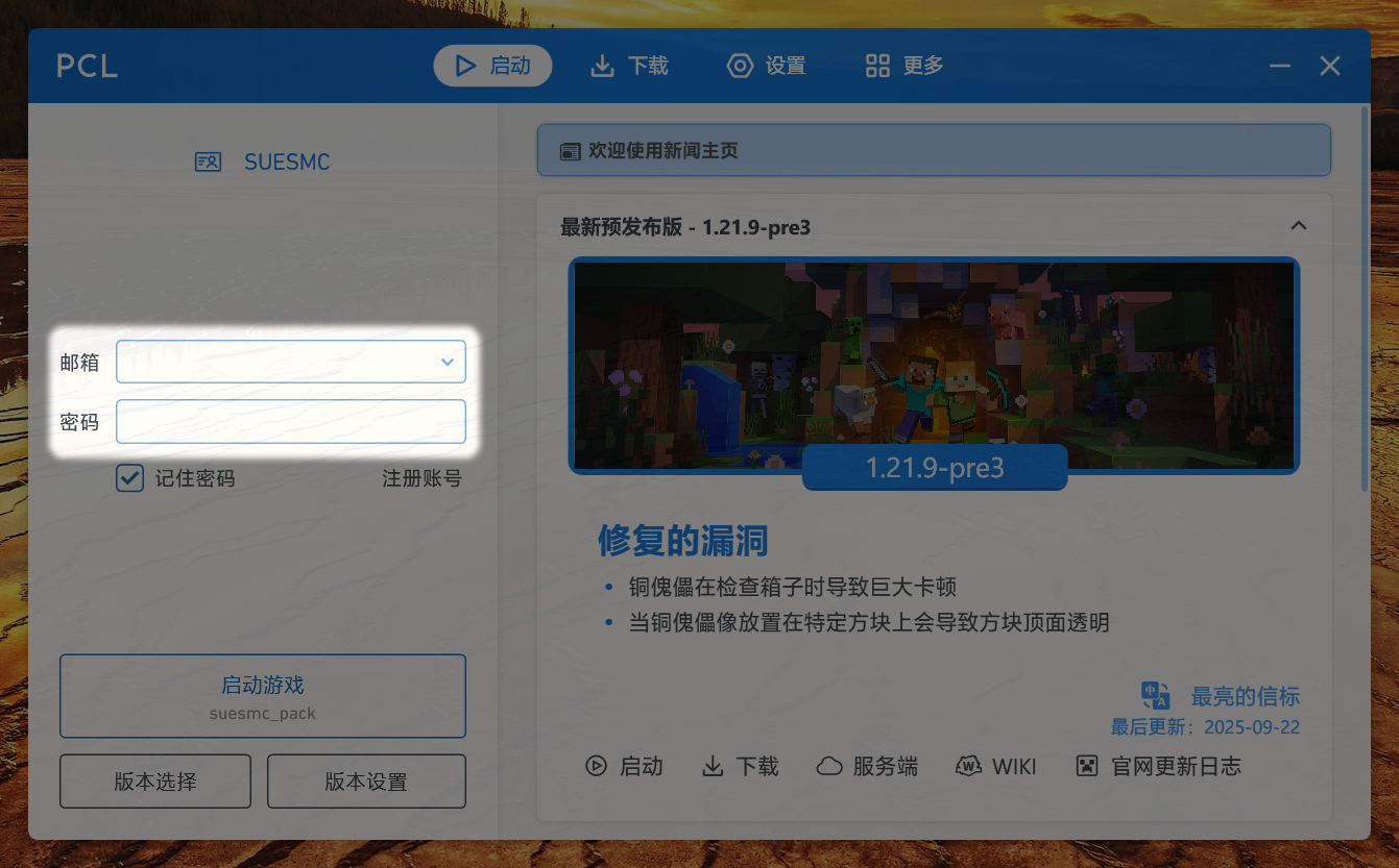 配置好账户后,回到 Plain Craft Launcher,在左侧的输入框内输入邮箱或角色名称和密码: