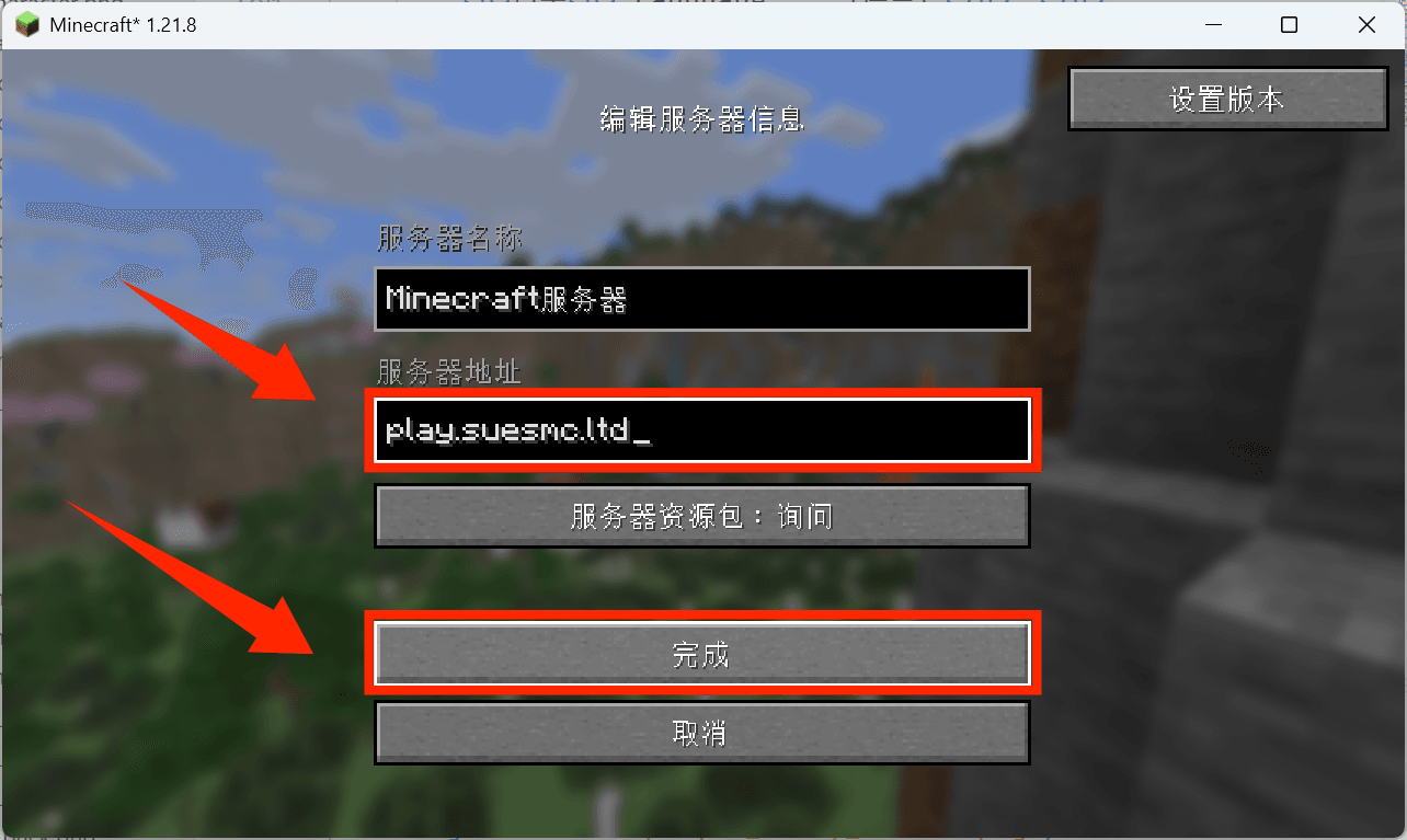 更改服务器名称,填写服务器地址等。服务器地址:play.suesmc.ltd。填写完成后,点击**“完成”**。
